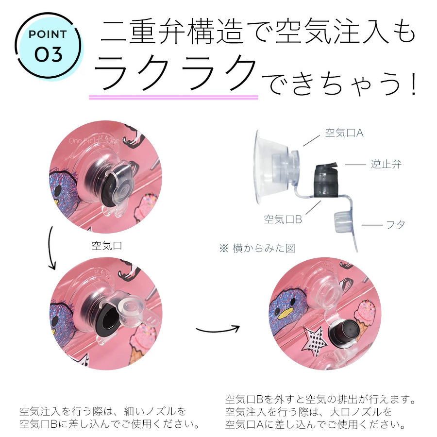 (※)空気栓は、『空気挿入口(逆止弁付き)』と『空気排出口』の2重構造となっています。空気排出口から空気を挿入することはできません。商品ページ掲載画像にてご確認ください。